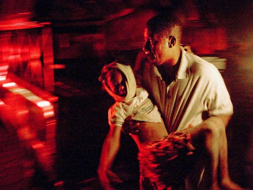 海地太子港,一名男子抱著受傷的孩子沖出損毀的樓房,尋找救援。