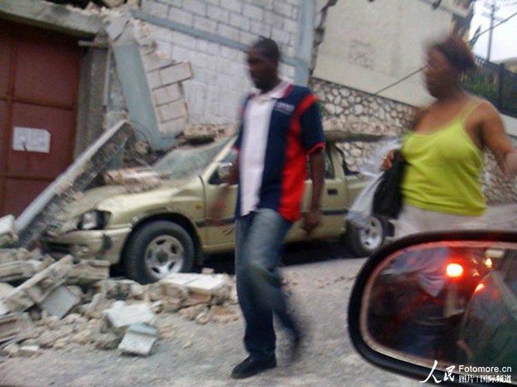 2010年1月12日,海地,太子港當地民眾從被埋在地震廢墟旁走過。