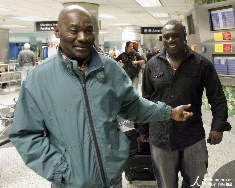 ????2010年1月12日,美國,邁阿密父親Joseph Valcin(左)到機場迎接從海地平安歸來的兒子Jocelyn Valcin(右)。發生地震時,Jocelyn Valcin正在海地首都太子港辦理登記手續。 |