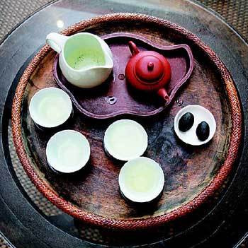 ????茶墊。形狀如盤而小,用以放置沖罐、承受沸湯。茶墊式樣也多,依時(shí)各取所需;夏日宜淺;冬日宜深,深則多容沸湯,利于保溫。茶墊之底,托以“墊氈”;墊氈用秋瓜絡(luò),其優(yōu)點(diǎn)是無(wú)異味,且不滯水,目前,因茶家多采用“茶船”,操作時(shí)并將沖罐置于上層茶盤,因此茶墊遂省。