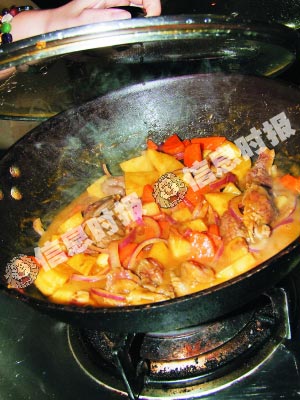 5、待牛腩燜煮至軟爛時(shí),放入咖喱膏,轉(zhuǎn)小火翻炒十?dāng)?shù)秒,再加適量清水熬煮。
