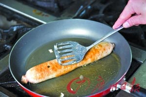 ????6.把花生油倒入鍋中燒熱,然后把灌腸外衣煎成金黃色。