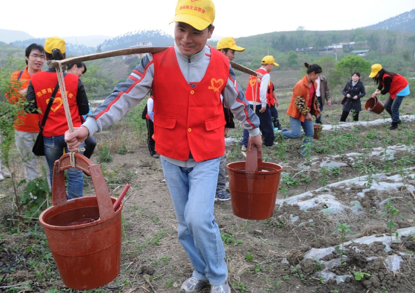 3月29日,廣西柳州市鹿寨縣的青年志愿者擔水準備灌溉土地。新華社發(賴柳生 攝)