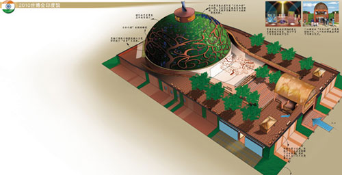 ????展館大門、廣場及中央穹頂的設計靈感分別來自印度的“SiddiSyed”寺、蘭普爾宮殿和桑奇佛塔。館內設置由古至今的城市時空之旅,精彩演繹“城市與和諧”的主題。參觀者可通過影像“時空隧道”游覽四五千年前的古印度、中世紀印度和現代印度,感受印度豐富的傳統文化、多樣化的宗教信仰、傳統與現代科技的發展、城市和農村的融合。