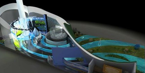????青海館的外部造型,全部采用流暢的曲線,突出了自然的特色。外墻的色調(diào)由明快的綠、白兩種顏色構(gòu)成,綠色代表著江河源頭的生命氣息和凈土特色,白色象征著高聳的昆侖雪峰。展館的主體造型由古篆書“源”字演化而來,它講述了三江源是生命之源、文明之源和城市之源。青海館選取長江、黃河、瀾滄江三大江河為元素,以昆侖天之極為載體,以圣水瑤池為情感內(nèi)涵,并以博大、包容為空間概念,勾勒出一個敞開式的展示空間。