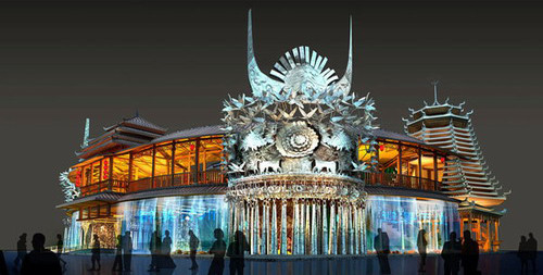 ????展館宛如一位身著盛裝的少數民族少女,放大了的銀飾左右擺動,相互撞擊,發出叮叮當當的響聲,給人聆聽音樂般的享受,使展覽有動有靜、有聲有色。環狀的風雨橋與銀飾連為一體,仿佛是盛裝少女的頭冠,而大面積的水簾猶如盛裝少女的短裙隨風搖擺。