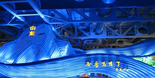 ????山東展館以最有代表性的山東元素,展示了古代圣賢智慧的金色之光、當代城市發展的綠色之道和未來美好家園的藍色愿景。具體內容分為三個板塊:過去——明禮儀的齊魯,現在——科學發展的山東,未來——和諧美好的家園。第一板塊為“智慧長廊”,承擔展館的序廳功能。這一部分重點展示山東古代城市文明,展示山東人對城市文明進步所貢獻的智慧。第二板塊為“城市窗口”,承擔展館的主展廳功能,將給觀眾展現一個繼承了傳統的齊風魯韻,開放進取、科學發展的山東。第三板塊為“齊魯家園”,承擔展館的尾廳功能。這一部分重點展示對未來城市發展的展望,和對未來生活、未來家庭的追求,讓參觀者了解未來的山東是一個9400萬人民共同擁有的美好家園。