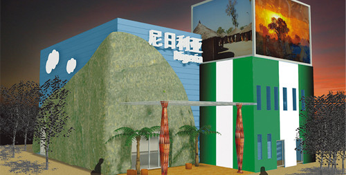 ????展館外墻模仿被評為非洲七大奇跡之一的“祖瑪巖”。“祖瑪巖”(ZumaRock)是一塊巨大的單塊巨巖,坐落于尼日利亞首都阿布賈北部,被視為“阿布賈的大門”,也是阿布賈標志性的景點。展館外觀融合尼日利亞國旗色,等候門廳設置諸多棕樹造型,營造尼日利亞的風情風貌。