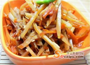????材料:牛蒡、魷魚干絲、胡蘿卜、雞湯、蔥、姜、蒜、鹽、糖、芝麻油、醬油等。