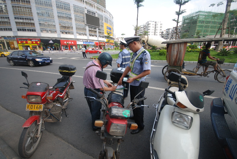 ??? 5月18日,交警在新興二路對過往的機動車進行檢查。針對前一個時期以來事故率較高的交通狀況,市交警蝶山大隊連日來開展了對轄區內的機動車進行專項整治行動,對無牌無證的機動車、幼兒園超載校車等進行重點查處,維護有序的交通秩序。 西江都市報記者 蒙紹松/攝