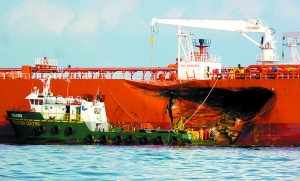 25日,與貨船相撞的馬來西亞籍油輪的左舷上出現(xiàn)一道10米長的裂縫,且出現(xiàn)漏油。當事兩船目前已離開相撞地點,停泊在新加坡。