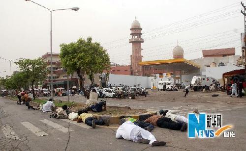 5月28日,在巴基斯坦東部城市拉合爾,媒體記者在一清真寺外臥倒避險。 新華社/法新