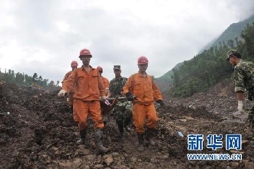 6月30日,救援人員在滑坡現場將搜尋到的遇難者遺體運送下山。新華社記者 歐東衢 攝