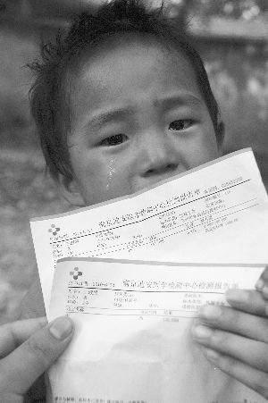 得知記者前來調查,大量村民帶著孩子來到村口。一份份檢測報告、一個個焦急的面龐、一個個啼哭的孩子。陽光透過樹縫,灑在村民搬到路邊的一張小方桌上,現場的氣氛顯得復雜而又沉重。面對記者的鏡頭,有的孩子一臉茫然,有的孩子哭鬧著喊個不停。村民們一遍又一遍講述的幾乎都是一樣的情節,不同的只是那一紙報告上血鉛的指標。