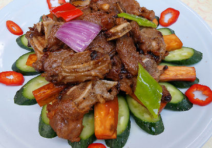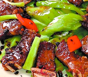 ??? 做法:牛仔骨洗凈,斬成長度為4厘米的塊狀備用;涼瓜切開去囊,洗凈后切片,以少許鹽拌勻,出水備用;開鍋下油,先將牛仔骨兩面煎香至金黃,取出,再起鍋爆香豆豉、蔥段和紅椒件,然后放回牛仔骨大火翻炒片刻,攢少許紹酒,下適量鹽、胡椒粉和美極醬油繼續(xù)翻炒至香氣溢出,最后調(diào)味收汁即成。