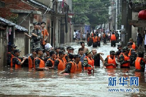 ????7月17日,消防官兵在廣水市應(yīng)山辦事處東大街搜救被困群眾。湖北省廣水市7月16日晚至17日晨出現(xiàn)歷史罕見的特大暴雨天氣,多個地區(qū)降水量在200毫米以上,引發(fā)嚴(yán)重洪澇災(zāi)害。災(zāi)情發(fā)生后,廣水市防汛抗旱指揮部迅速啟動一級應(yīng)急響應(yīng),動員各方力量抗洪救災(zāi)。新華社發(fā)