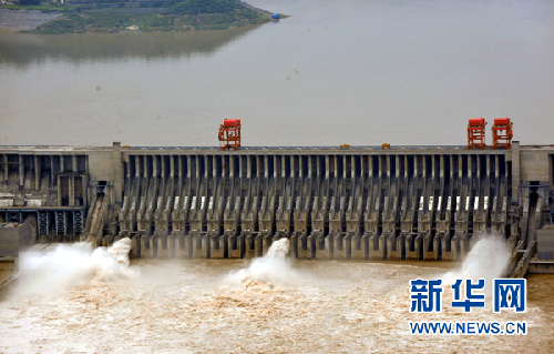 ??? 7月17日下午,三峽大壩開啟4個泄洪深孔和1個排漂孔,將出庫流量由32000立方米/秒增大到34000立方米/秒以下泄洪水。據當地氣象部門預報,中國長江三峽集團公司預測未來2-3天內,三峽大壩將迎來一次峰值在65000立方米/秒左右的洪水,堪比1998年長江三峽河段的最高峰值,這也將是三峽水庫建成以來所面臨的規模最大的一次洪水挑戰。為此,三峽正增大出庫流量以騰出足夠多的防汛庫容應對洪水。新華社發(鄭家裕 攝)