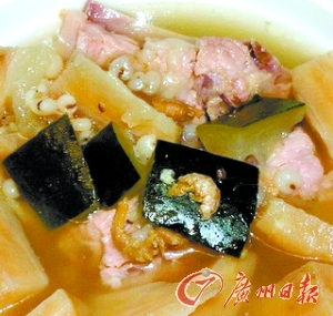 ????做法:排骨洗凈斬件,以鹽、胡椒粉和米酒腌制2小時備用;薏米以溫水浸泡3小時,備用;粉葛去皮洗凈,切片備用;冬瓜洗凈,切塊備用;開鍋燒開雞湯,下薏米、粉葛、冬瓜和蝦米煮25分鐘,再放入排骨繼續煮20分鐘,然后調味即成。
