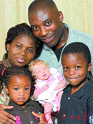 ????本報訊 據英國媒體20日報道,一對英國黑人夫婦近日生下一個金發藍眼的白皮膚女兒,不僅讓這對父母大惑不解,也讓遺傳學家十分困惑;而醫生們已經表示,這個嬰兒并沒有得白化病。