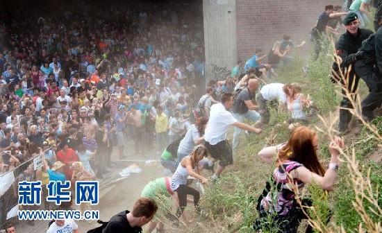 7月24日,在德國西部杜伊斯堡,參加“愛的大游行”音樂節的人群發生惶恐后奪路而逃。新華社/法新