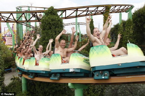 ????據英國媒體報道,當地時間8月8日,102名英國男女齊聚艾塞克斯郡冒險島游樂園,將衣服全部脫掉,體驗裸體乘坐“綠色尖叫”過山車的刺激感覺。這102人也創造了一項新的世界紀錄。