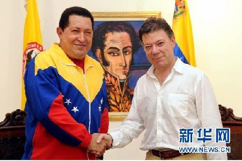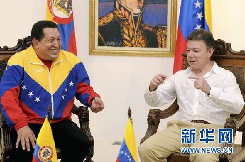 ????8月10日,哥倫比亞總統(tǒng)桑托斯(右)在圣瑪爾塔會見到訪的委內(nèi)瑞拉總統(tǒng)查韋斯。當天,哥倫比亞總統(tǒng)桑托斯在與委內(nèi)瑞拉總統(tǒng)查韋斯會談后宣布兩國恢復外交關(guān)系。 新華社/路透