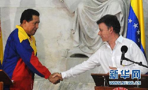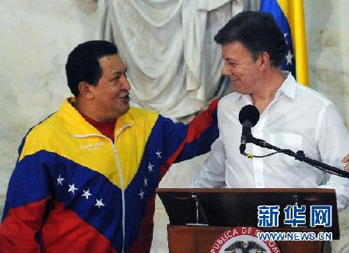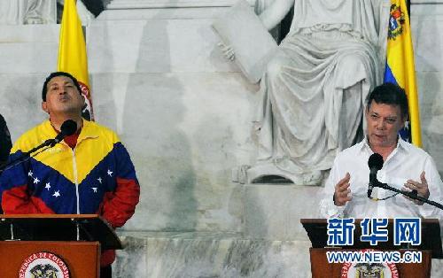 ??? 8月10日,哥倫比亞總統桑托斯(右)在圣瑪爾塔與到訪的委內瑞拉總統查韋斯舉行會談后與媒體見面。當天,哥倫比亞總統桑托斯在與委內瑞拉總統查韋斯會談后宣布兩國恢復外交關系。 新華社/法新