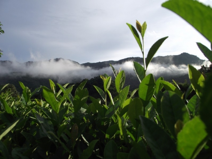 ????近處的茶園生機(jī)勃勃,遠(yuǎn)處的云霧像一條巨龍橫臥在兩山之間。