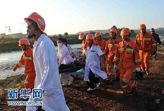 8月16日,工作人員從爆炸現(xiàn)場抬出一位傷者。新華社記者王建威攝
