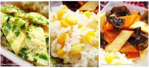 ??? 這款便當(dāng)?shù)闹魇呈怯衩罪垼洳擞星谐尚K的小蔥雞蛋餅、粗纖維豐富的胡蘿卜茭白炒木耳。