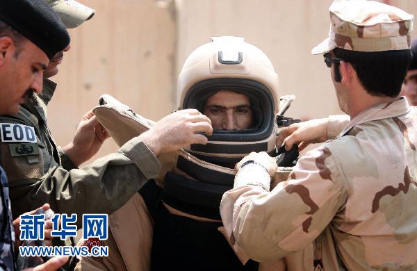 8月17日,在伊拉克西部的巴古拜附近,戰友幫助進行拆彈訓練的伊拉克拆彈專家穿防護服。新華社/法新