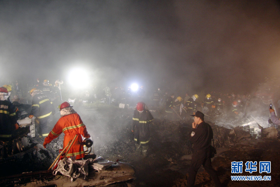 2010年8月25日 伊春飛機失事已確認有43人遇難 8月25日凌晨,救援人員在飛機失事現場搜尋幸存者。 24日21時36分左右,一架從哈爾濱飛往伊春的客機在接近伊春機場跑道時失事,這架飛機的航班號為VD8387。據了解,機上共有旅客91人(其中兒童5人),機組5人,目前已確認43人遇難,另外53名傷者已全部收治在當地醫院。新華社發(李廣福 攝)