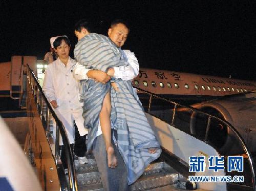 ????8月25日晚,在哈爾濱太平國際機場,一名伊春空難受傷男孩被抱下飛機。當晚,伊春空難中的15名傷員搭乘南方航空公司包機抵達哈爾濱,隨后被送入當地四家醫院接受進一步治療。 新華社發(張清云 攝)
