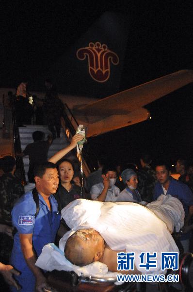 ??? 8月25日晚,一名伊春空難重傷員抵達哈爾濱太平國際機場。當晚,伊春空難中的15名傷員搭乘南方航空公司包機抵達哈爾濱,隨后被送入當地四家醫院接受進一步治療。 新華社發(張清云 攝)