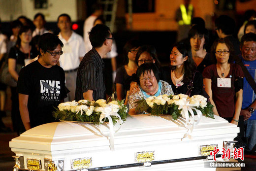 8月25日晚上,在菲律賓挾持人質事件中傷者及家屬的包機返抵香港,8副靈柩亦運返香港。部分死者家屬在告別儀式上痛不欲生。中新社發 洪少葵 攝