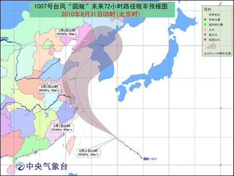 ??? 預(yù)計(jì),“圓規(guī)”將以每小時(shí)25公里左右的速度向西北方向移動(dòng),強(qiáng)度還將略有加強(qiáng),將于31日晚上進(jìn)入東海東南部海面,以后逐漸向浙江北部到江蘇中部一帶沿海靠近,并有可能于9月1日白天擦過(guò)或登陸這一帶沿海北上。