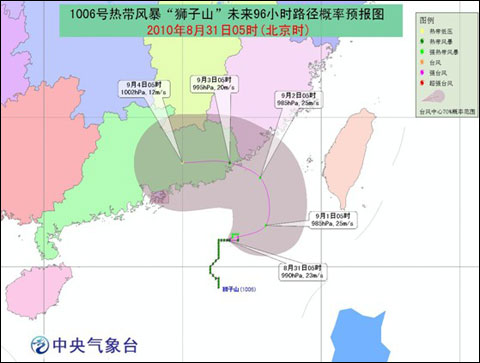 ??? 今年第6號(hào)強(qiáng)熱帶風(fēng)暴“獅子山”已于31日3時(shí)在南海北部海面減弱為熱帶風(fēng)暴, 5時(shí)其中心位于廣東汕頭以南大約270公里的海面上,就是北緯20.9度、東經(jīng)116.6度,中心附近最大風(fēng)力有9級(jí)(23米/秒),中心最低氣壓為990百帕。預(yù)計(jì),"獅子山"將在原地徘徊少動(dòng),以后將逐漸由偏北方向轉(zhuǎn)西北方向移動(dòng),強(qiáng)度有可能再度加強(qiáng),并向廣東東部到福建南部一帶沿海靠近。