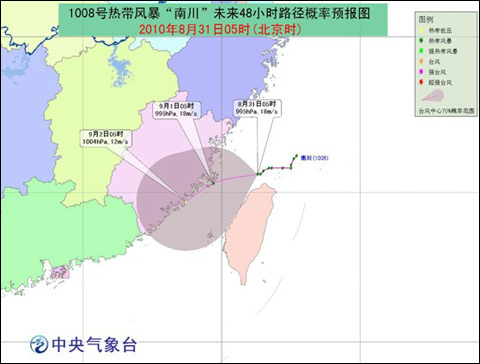 ????今年第8號(hào)熱帶風(fēng)暴“南川”(Namtheum,名字來(lái)源:老撾,名字意義:河流名)的中心31日5時(shí)位于福建平潭以東大約140公里的東海南部海面,就是北緯 25.6度、東經(jīng)121.3度,中心附近最大風(fēng)力有8級(jí)(18米/秒),中心最低氣壓為995百帕。預(yù)計(jì),風(fēng)暴中心將以每小時(shí)5-10公里的速度向西偏南方向移動(dòng),逐漸向福建連江到泉州一帶沿海靠近,有可能于31日夜間到9月1日白天擦過(guò)或登陸這一帶沿海,強(qiáng)度緩慢減弱。