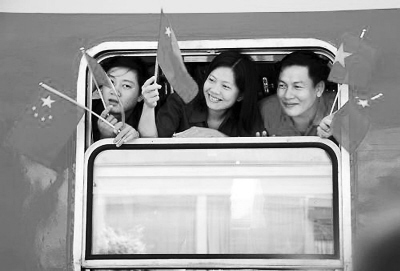 越南青年在列車上揮舞兩國(guó)國(guó)旗 新華社記者 盧哲攝