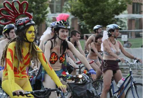 ????活動中,一部分勇敢前衛的男女全身赤裸騎車,其他人則或者在身上涂滿油彩,或者穿著泳裝,略略遮羞。