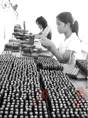 ???圖為人工寶石質(zhì)檢員正按標(biāo)準(zhǔn)嚴(yán)格檢驗(yàn)產(chǎn)品質(zhì)量