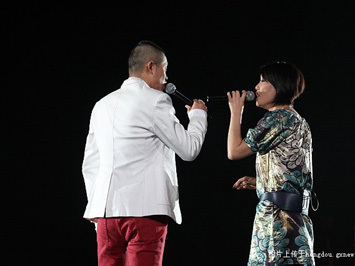 ●現場演繹:鳳凰傳奇是一個活力十足的演唱組合,他們一出場就帶給觀眾一種歡快的節慶氛圍。曾毅一條紅色的褲子非常顯眼,玲花則身穿一條素色連衣裙,二人通過《自由飛翔》,將動感的音樂傳給每一個人。而他倆的配合也相當默契,一人唱歌的時候,另一人和著音樂起舞,并不時向觀眾揮手致意。