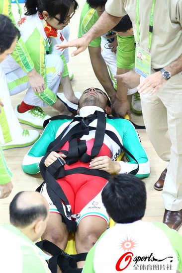 凱琳賽是自行車比賽中非常危險的一個項目,賽前參賽各隊的教練都打了招呼,比賽中注意技術動作,可是意外最終還是發生了,進入決賽的共有六名選手。中國兩人、馬來西亞兩人、日本和伊朗選手各自一人。可高速中,還是發生了意外,最后一圈選手全部加速。中國選手張磊和馬來西亞選手JOSIAH發生了身體接觸倒地,身后的伊朗選手帕拉什·默哈默德躲閃不及,壓在了張磊淼的自行車上摔出去足有十米遠。其他選手繼續騎行完成了比賽,現場的工作人員和隊醫紛紛沖去場內。不少在看臺上的中國隊工作人員也沖了下去。中國運動員張磊在地上躺了三分鐘后站起來,自己走回休息區并且向高呼“好樣的”的觀眾揮手致意。可是伊朗運動員默哈默德的傷勢就嚴重的多,經過了大約三分鐘的救治后,他被抬上了擔架,并被直接推到救護車上。面對這樣的慘劇,現場觀眾用鼓掌送上祝福。