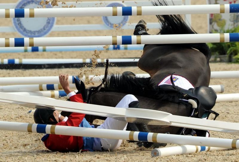 亞運(yùn)會(huì)馬術(shù)障礙團(tuán)體賽在馬術(shù)場(chǎng)進(jìn)行。圖為馬來西亞選手賽義德馬失前蹄被迫退出比賽。李錦河 攝