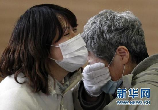 3月15日,在日本巖手縣的一個臨時避難所內(nèi),一名婦女與親人團(tuán)聚后哭泣。 新華社/路透