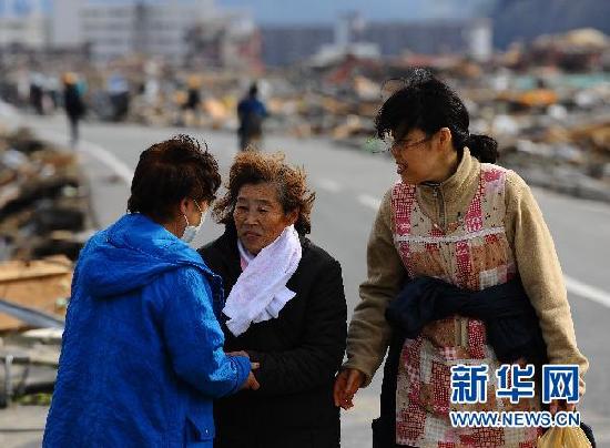 ??? 3月14日,在日本宮城縣南三陸町,幾位相識的災民路上偶遇時相互問候。日本宮城縣南三陸町在11日強震引起的大海嘯中,主要區(qū)域幾乎被夷為平地。死傷、失蹤者估計超過1萬人。14日,記者在災區(qū)看到,廢墟前時有災民經(jīng)過,他們有的在尋找家的位置,有的從較遠的損失不重的親戚家拿來少量的水、食品,有的在整理破敗的房子......他們對記者說,能活著已經(jīng)是奇跡了,接著要重建家園,堅強地生活。 新華社記者 季春鵬 攝