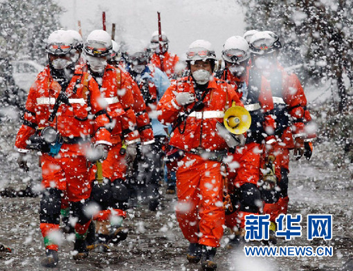 日本仙臺(tái),搜救隊(duì)員在雪中行進(jìn)。
