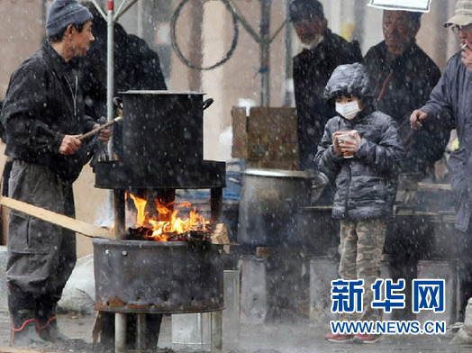 3月16日,日本宮城縣仙臺(tái)市,一個(gè)男孩在雪中等候開水泡面。從15日夜間開始,強(qiáng)冷空氣襲擊日本地震災(zāi)區(qū),大部分地區(qū)降起了大雪。由于災(zāi)區(qū)大部分地區(qū)斷電,有近2000個(gè)避難場(chǎng)所沒有空調(diào),此外燃油短缺,煤油取暖器無法使用。加上毛毯不足,災(zāi)民生活情形十分的困難。