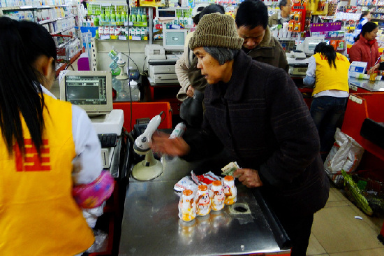在億佳超市夢之島店的正門出口,兩個收銀臺皆只有零星幾人排隊。覃燕霞 攝