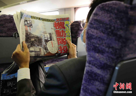 ??? 3月17日下午,在一列前往東京的新干線列車上,一名日本人在閱讀關于福島核電站三號機組最新狀況的報道。中新社發 侯宇 攝